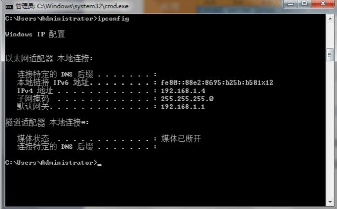 三、查询自己的电脑的内网IP。从本机电脑 开始-->运行cmd-->在跳出的cmd对话框里键入ipconfig-->回车IPv4地址就是本机内网的IP。
