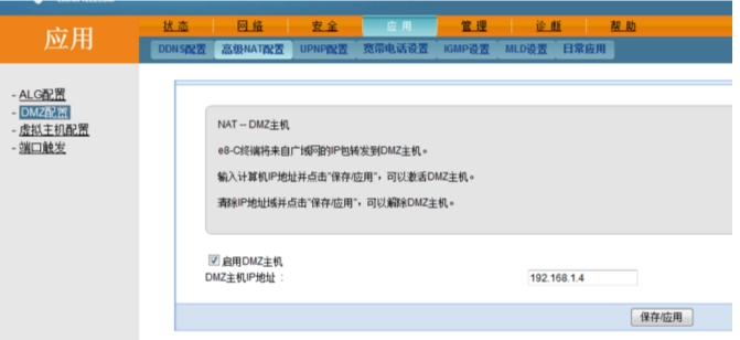 把内网IP填入DMZ主机IP地址,然后点击保存应用即可。